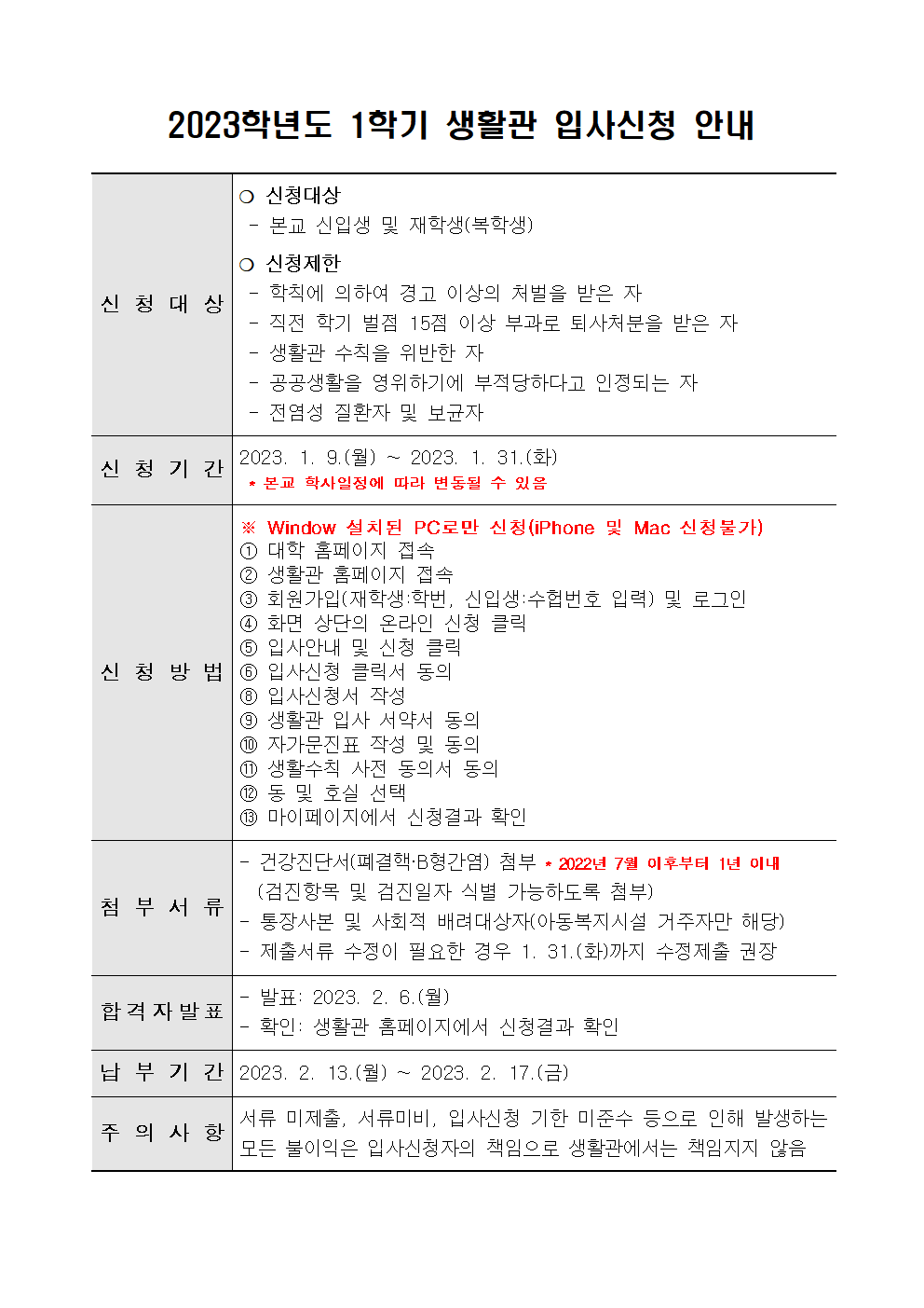 2023학년도 1학기 생활관 입사신청 안내