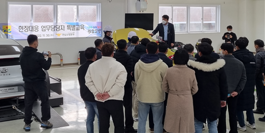 “전기자동차 화재 대응 교육”은 최근 전기자동차 보급의 확대로 전기차 화재와 폭발 등 전기차 관련 사고가 증가함에 따라 위급상황에서의 위험요소를 선제적으로 제거하고 안전한 환경에서 인명구조가 이루어질 수 있도록 하여 일선 소방관이 안전을 확보하기 위한 목적도 있다. 교육내용은 전기자동차 사고현장에서 감전사고 등 2차 피해를 예방하기 위해 전기자동차의 구조와 특징 고전압 부품 사고 시 초기 대응 절차 및 고전압 차단 방법 등을 실제 전기차를 이용해 학습함으로써 참여한 소방관에게 실질적이 도움이 될 수 있도록 하였다.