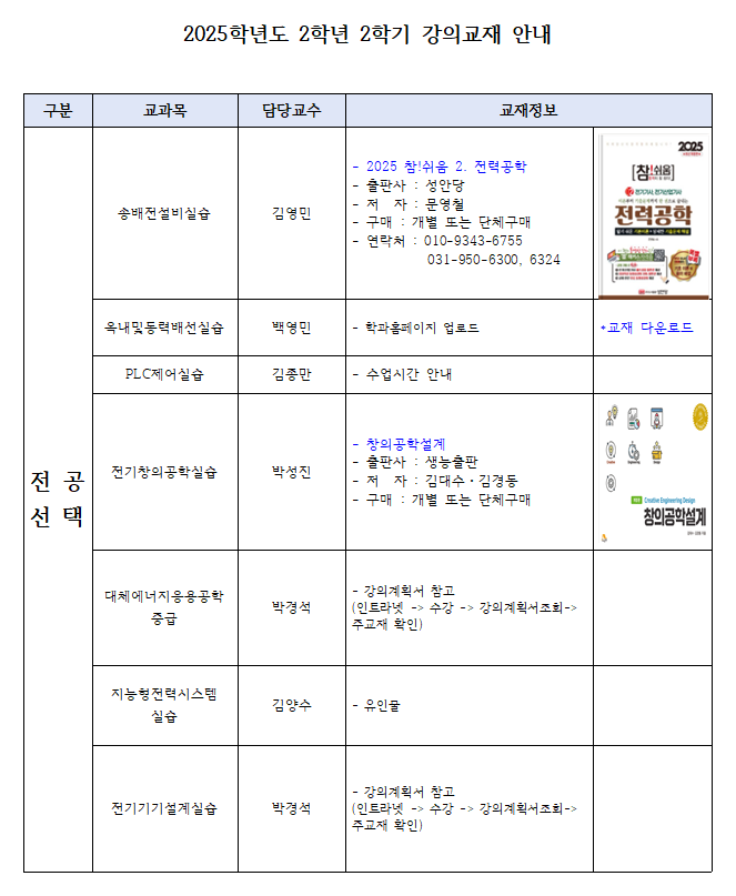 2025학년도 2학기 강의교재 안내(2학년)