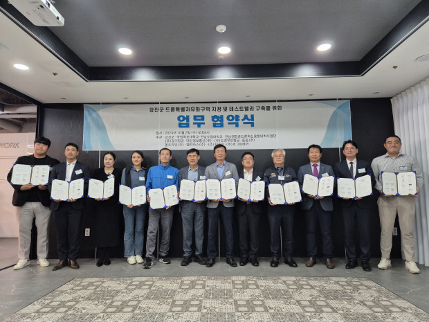 강진군이 지난 2일 목포대·전남도립대·드론 기업체 등과 드론서비스 모델 실증을 위한 업무협약을 맺었다. 강진군 제공