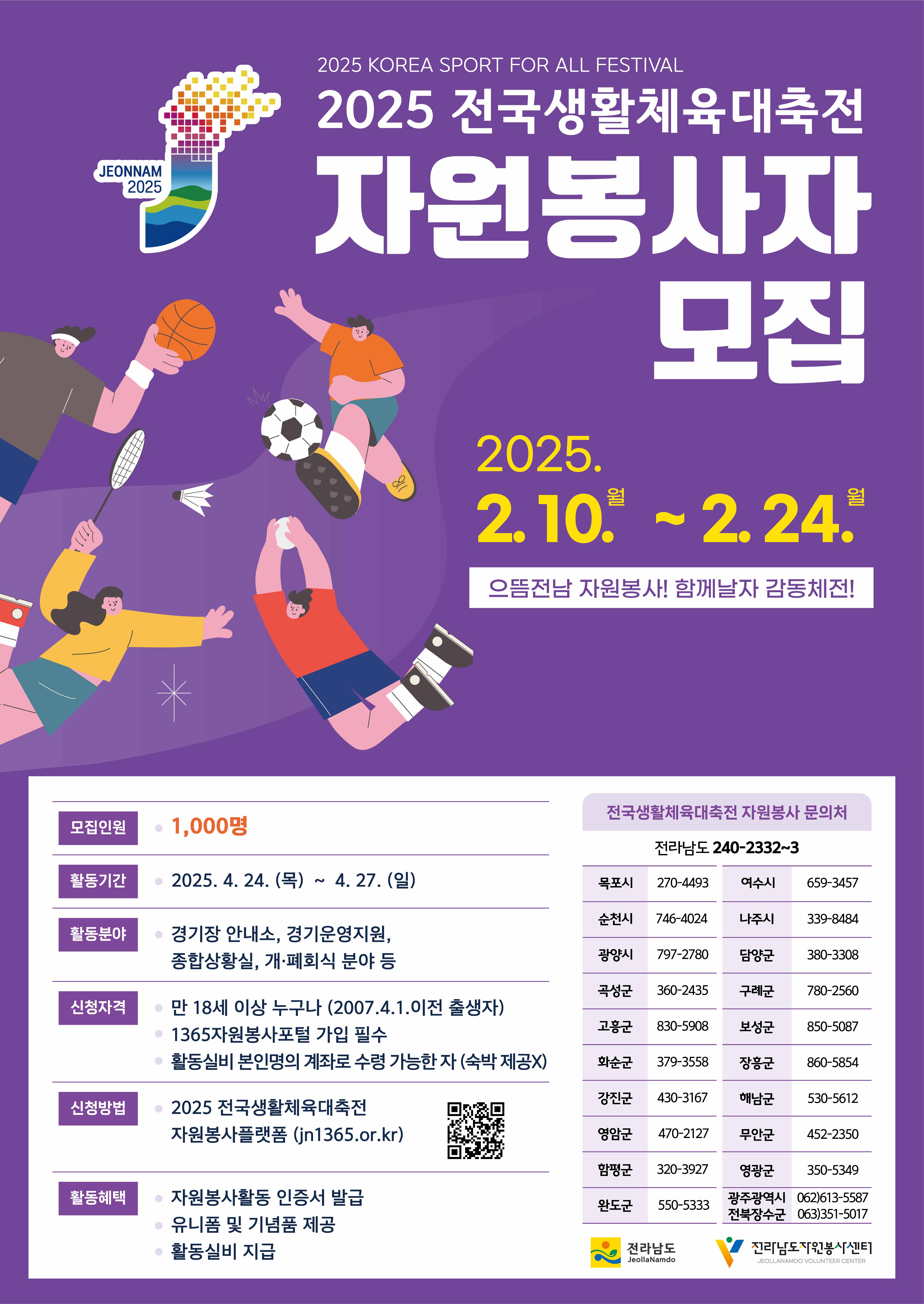가. 모집기간 : 2025. 2. 10.(월) ~ 2. 24.(월) / 15일간나. 모집인원 : 1,000명다. 신청자격 : 만 18세 이상(2007. 4. 1. 이전 출생자) 누구나라. 신청방법 : 온라인(jn1365.or.kr) 및 활동지역 시·군 자원봉사센터 방문신청