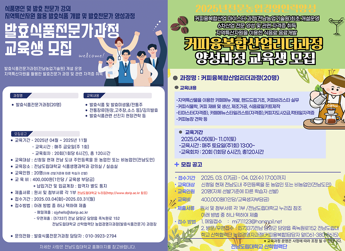 2025년 농업경영자과정(발효식품전문가, 커피융복합산업리더) 교육생 모집