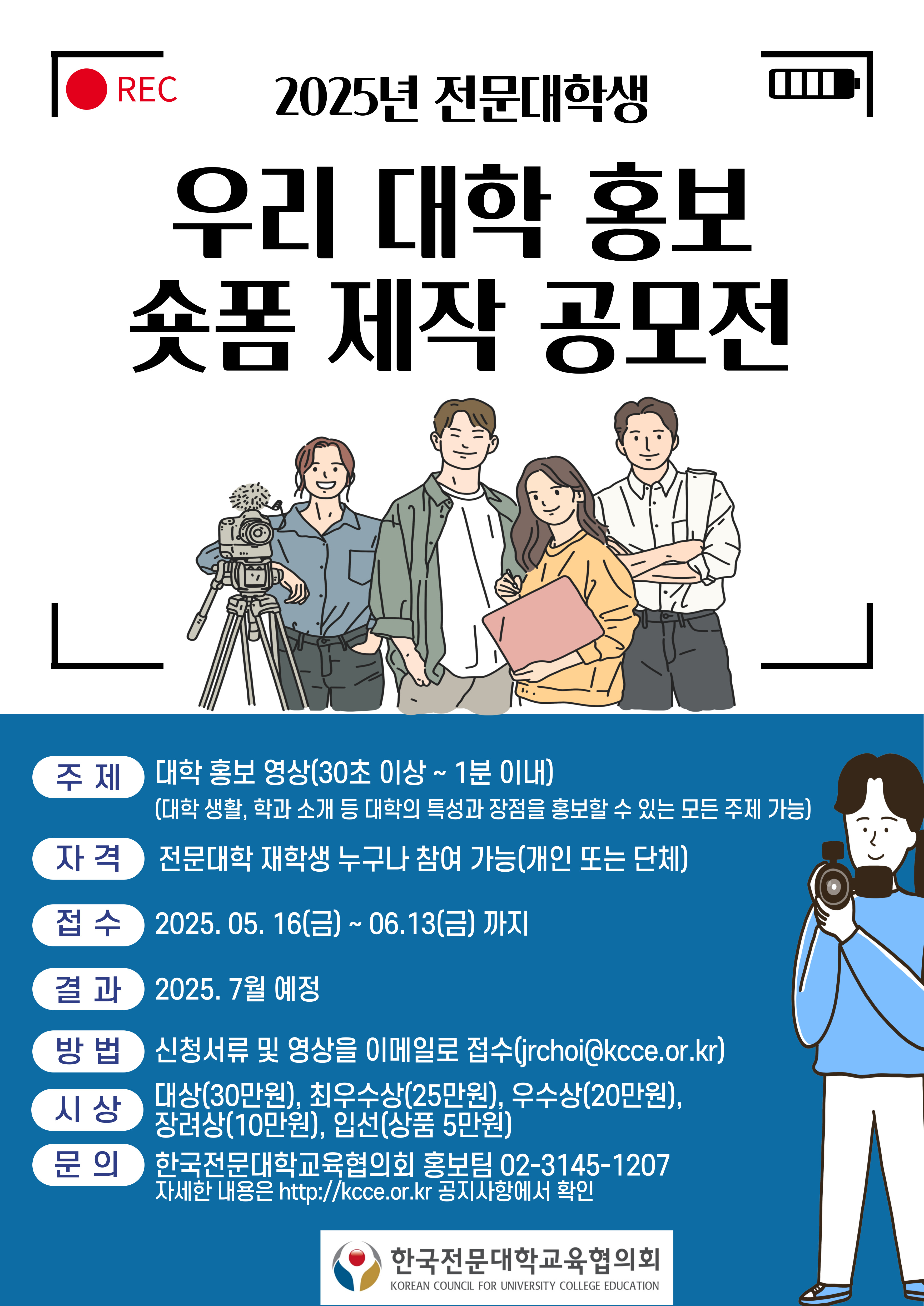 - 재학중인 대학 캠퍼스, 생활, 학과(전공), 인상 깊은 교수ㆍ직원 소개 등 대학의 특성과 장점을 보여줄 수 있는 모든 주제의 홍보영상(숏폼)
