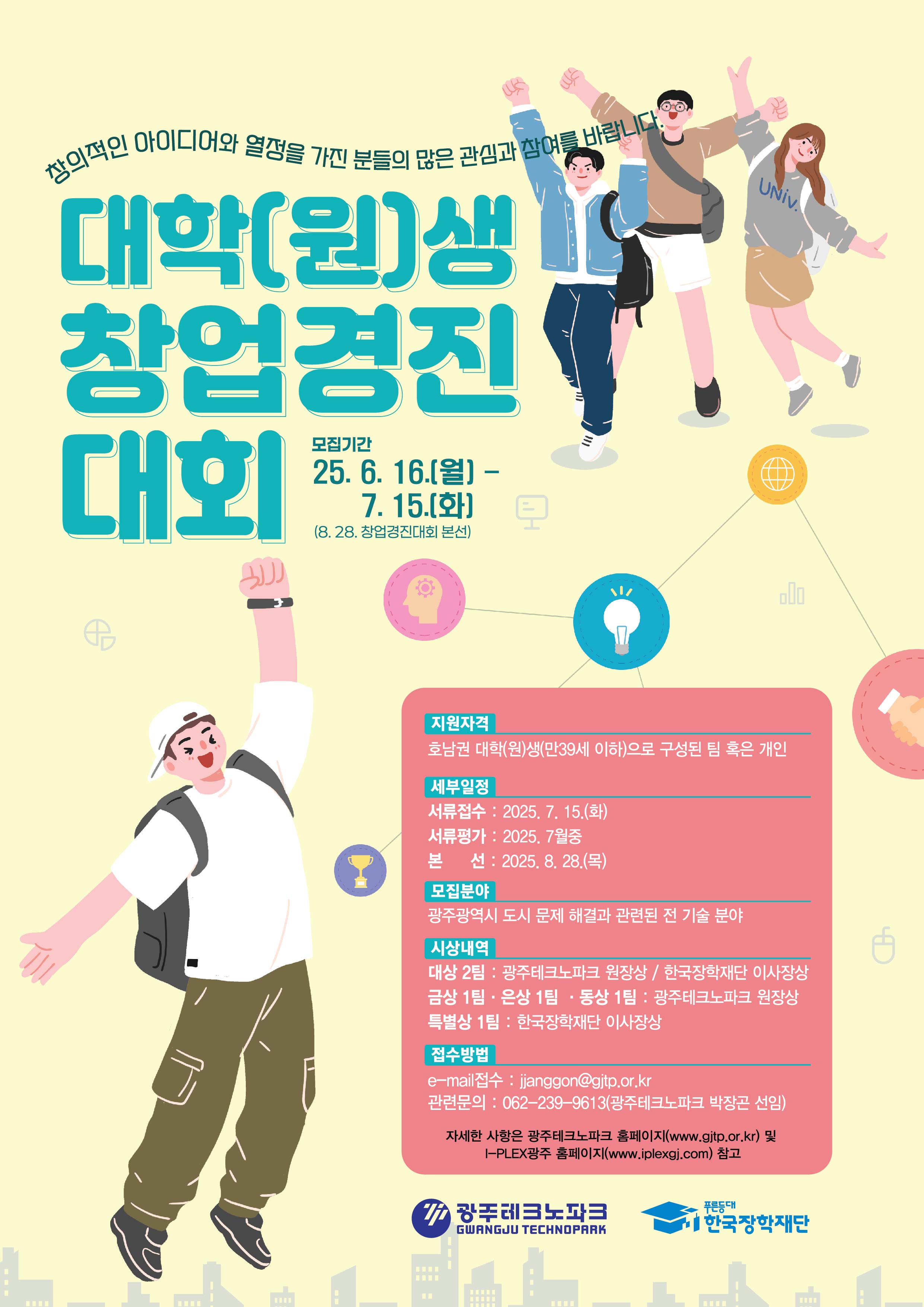 가. 대회명: 한국장학재단-광주테크노파크 대학(원)생 창업경진대회나. 접수기간: 2025. 6. 16.(월) ~ 7. 15.(화) 18:00다. 접수규모: 총 OO명(개인 또는 팀)라. 접수분야: 광주광역시 도시 문제 해결과 관련된 전 기술 분야마. 지원자격: 호남권 대학(원)생(만 39세 이하)로 구성된 팀 또는 개인
