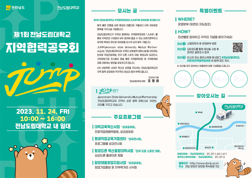 지역과 대학이 함께 참여하고 즐길 수 있는 제1회 전남도립대학교 지역협력공유회 「JUMP」 를 아래와 같이 개최하오니 많은 참석 부탁드립니다.